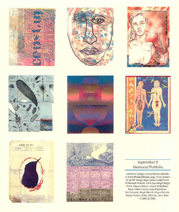 11 Memorial Portfolio We are still stunned by the terrorist attacks of September 11, 2001. For artists and all those who value the diversity of our lives, understanding this loss is exceptionally difficult. It is hard to comprehend three thousand innocent people killed in one day, not by a natural disaster, but by men who want to destroy the freedom of our way of life. The idea of commemorating the victims with a memorial of images on paper, rather than stone or steel, is a reflection of our art. The portfolio is a simple and prevalent format among printmakers, which allows even a large group of prints to be sent for exhibition to many places. And this portfolio is very large, 445 artworks donated by artists from the United States, Canada and ten additional countries. The Memorial Portfolio is not about economic, political or military consequences of terrorism. It is our way to turn the symbolism around. Thousands of people died because this country respects freedom of religion and speech and encourages all individuals to reach their full potential. We celebrate their individuality in that spirit of creativity. We hope our expression of sympathy comforts their families and friends, a nation and the world. Dr. Carol Pulin, director of the American Print Alliance, started this project by suggesting that we ask each of our artists to create one print to commemorate one person. A memorial portfolio is a way to help us understand the loss of so many individual lives. The Vietnam memorial is eloquent and moving because we read names and, even if we don't recognize any of them, we recognize common first names and last names. They were mostly soldiers and it seems appropriate that the names are carved alike, as in traditional war memorials that stand in town squares around the world. The Oklahoma City memorial for the Murrah Building victims is composed of scattered groups of simple chairs. Some are small chairs for children, but they are otherwise stylized and alike. Although it is a terribly large number, one can grasp 168. But for thousands of people, the artworks have to be different, individual images for the concept to be effective. People will inevitably be drawn to certain pictures: some will spend time with those portraying a scene, others will find meaning in abstract colors. As viewers walk along, they will stop to think about some here and there, be drawn to another down the row, just as they might be intrigued by various faces in a crowd. To convey the sheer number and the individuality of each life is the challenge. Speakers will tell us about acts of courage and compassion, and writers will recount memories of each man, woman and child. We, however, are thankful for the language of art and especially prints. Besides a heritage of responding to social and political needs, we offer an evocation of life that crosses cultural and national boundaries. Representatives from each Alliance council thought deeply about the issues and offered their intense reflections in introspective comments. The initial premise that every artwork submitted would be included in the portfolio because each represented a life shaped our decisions on all the major factors: theme, size, display and media. To encourage all artists to take part, even if their printmaking usually requires complex processes or expensive press time, we accepted other techniques as well as prints (etchings, lithographs, screenprints, woodcuts, etc.). Drawings, watercolors, photographs, handmade paper, all original works of art on or of paper fit in this conceptual portfolio. Each contributing artist is a member of an Alliance council or a subscriber to our journal, Contemporary Impressions. The imagery is as distinct as the artists, who range in age from high school students to retirees. They chose to commemorate life with landscapes, figures, city scenes and abstractions. Many responded with expressions of sorrow or of hope. Some artists portrayed the everyday activities and joys of living. Thus, this portfolio is intended to cherish memories of life, with artwork as individual as those who are no longer with us. The scale of the project will unavoidably remind everyone of the number of innocent lives lost. The power of this memorial will come from seeing the actual prints on exhibition in so many communities, demonstrating the role of the arts in all our lives. The size of the artwork and the form of display are more than usually inextricably linked, because they will be seen as symbolizing facets of the theme, affecting the portfolio's emotional power. The initial idea immediately called to mind the office papers raining down on New York City from the damaged towers of the World Trade Center. The standard size of office paper would be an eloquent evocation of that phenomenon, but also an exceptionally disturbing memory of senseless destruction. We wanted to commemorate people, not memorialize acts of violence. So we chose 8 x 10 inches, a size that would still evoke those floating papers, but that we hope will remind viewers more of pictures from a family photo album or pages from an artist's book. Thinking about arranging so many artworks in a simple grid, a format often used in galleries today, led us to refine the display and apply its qualities as a deliberate visual strategy. A grid in this context recalls well known photographic installations by Christian Boltanski, especially those based on the last yearbook from a Jewish high school in Berlin closed in 1938. The formal structure could distance the display from the heart rending photocopied images of the missing posted all over lower Manhattan (and we reminded artists, even those who wanted to create a work about someone they knew personally, to respect the privacy of grieving families). The strings of artwork have an obvious analogy to a clothesline, a very mundane, everyday device in contrast to the enormity of the tragedy. So the display also recalls the Tibetan traditio